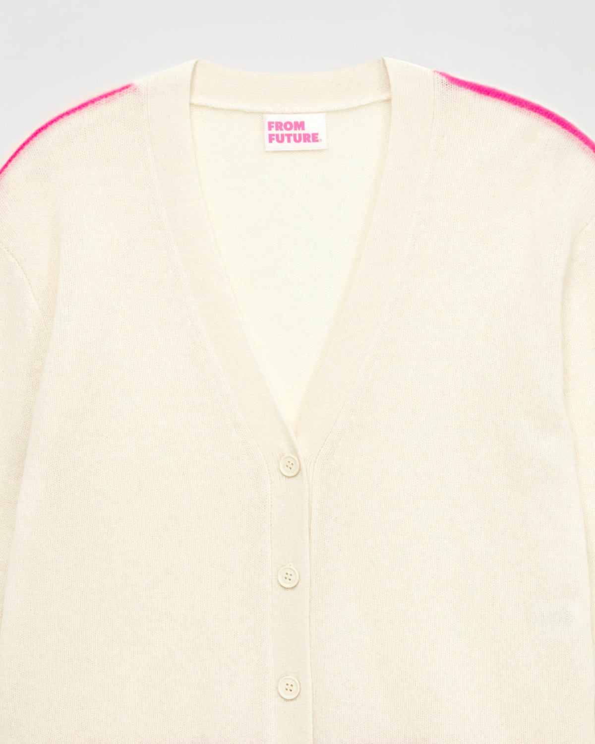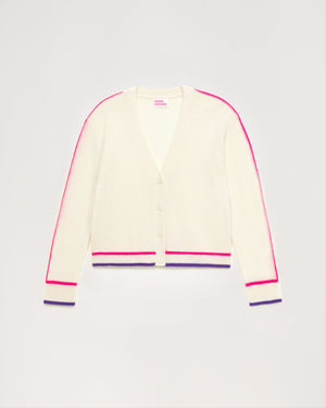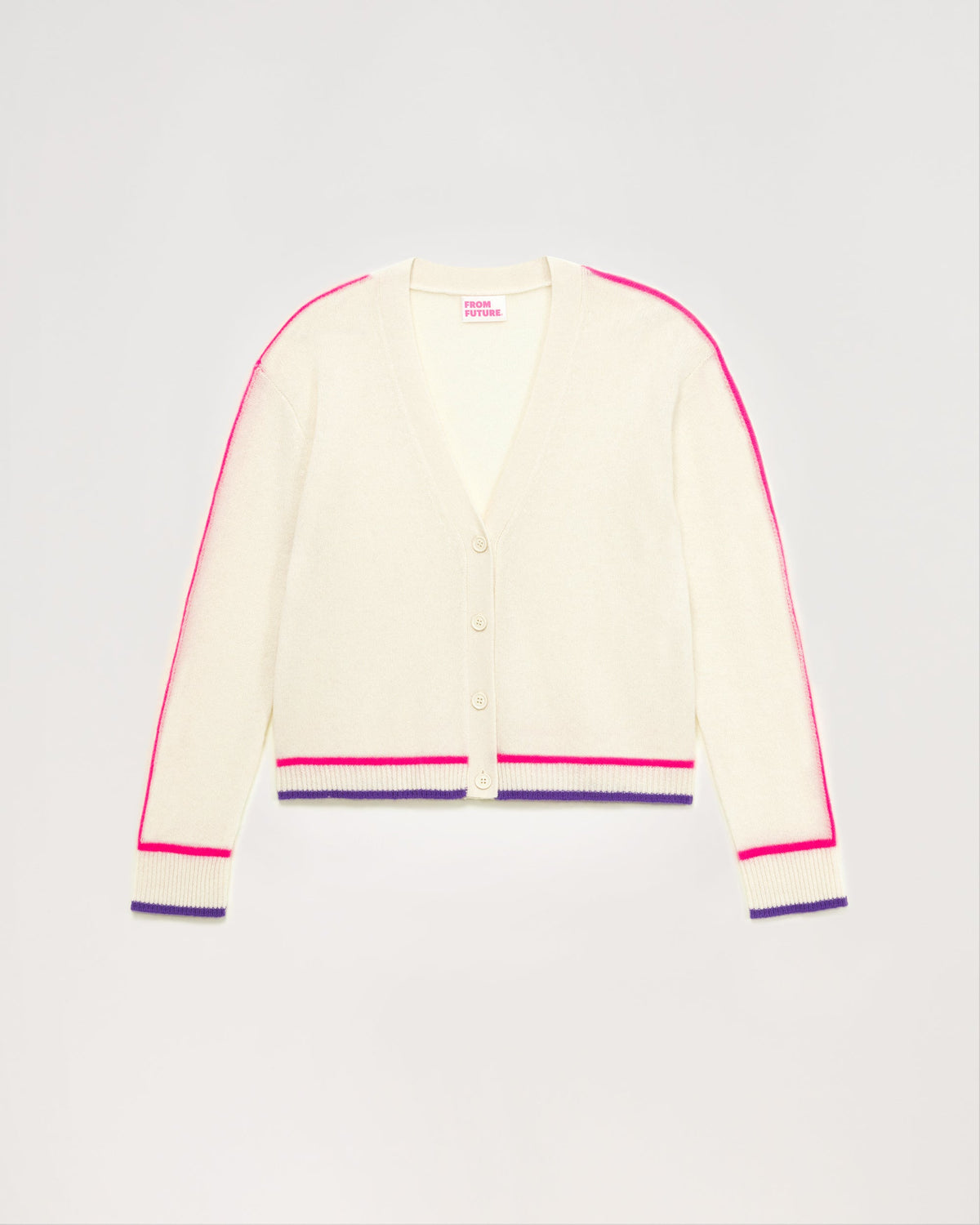 Short cardigan with contrasting bands 2 wires - 100% Cachemire - Écru