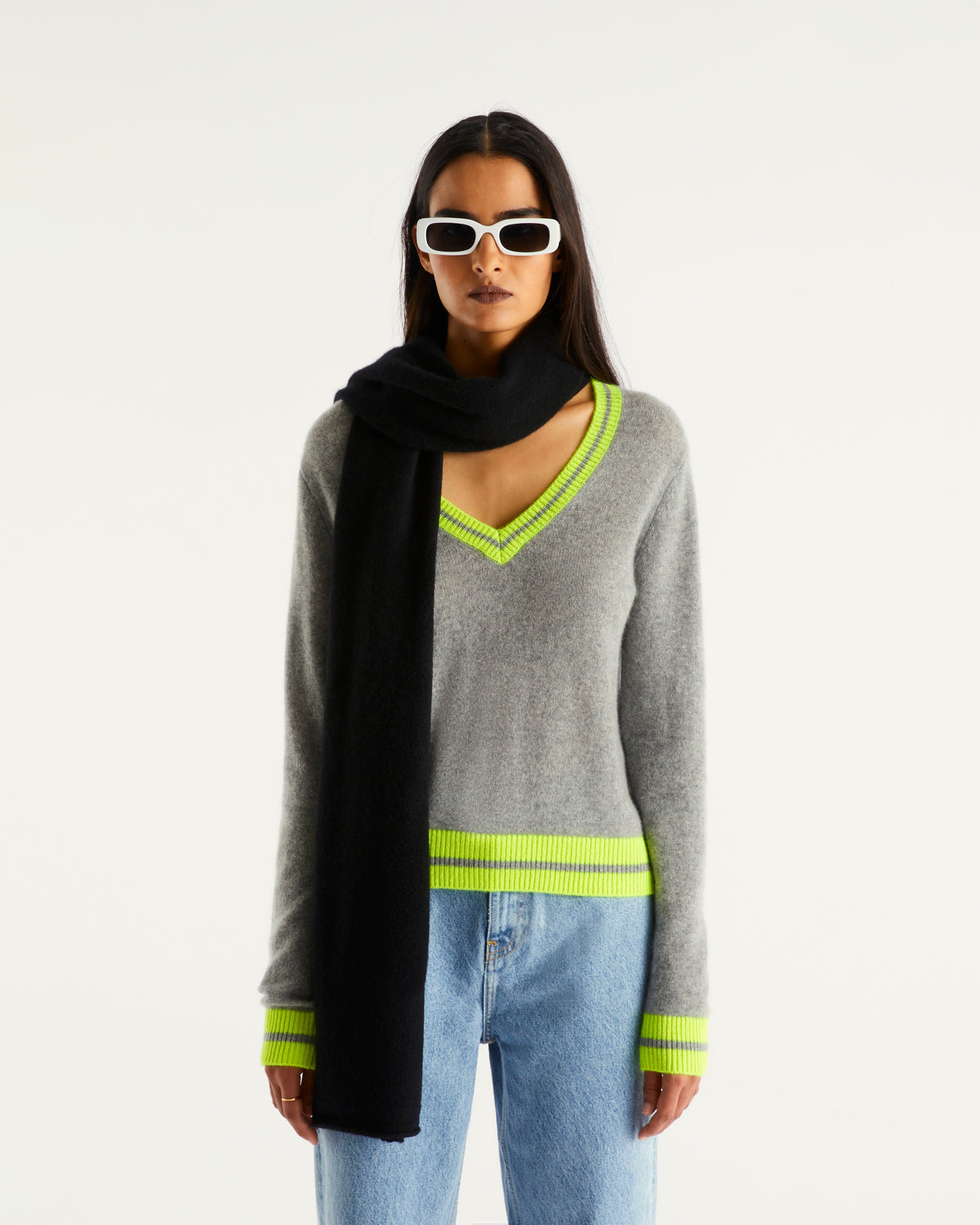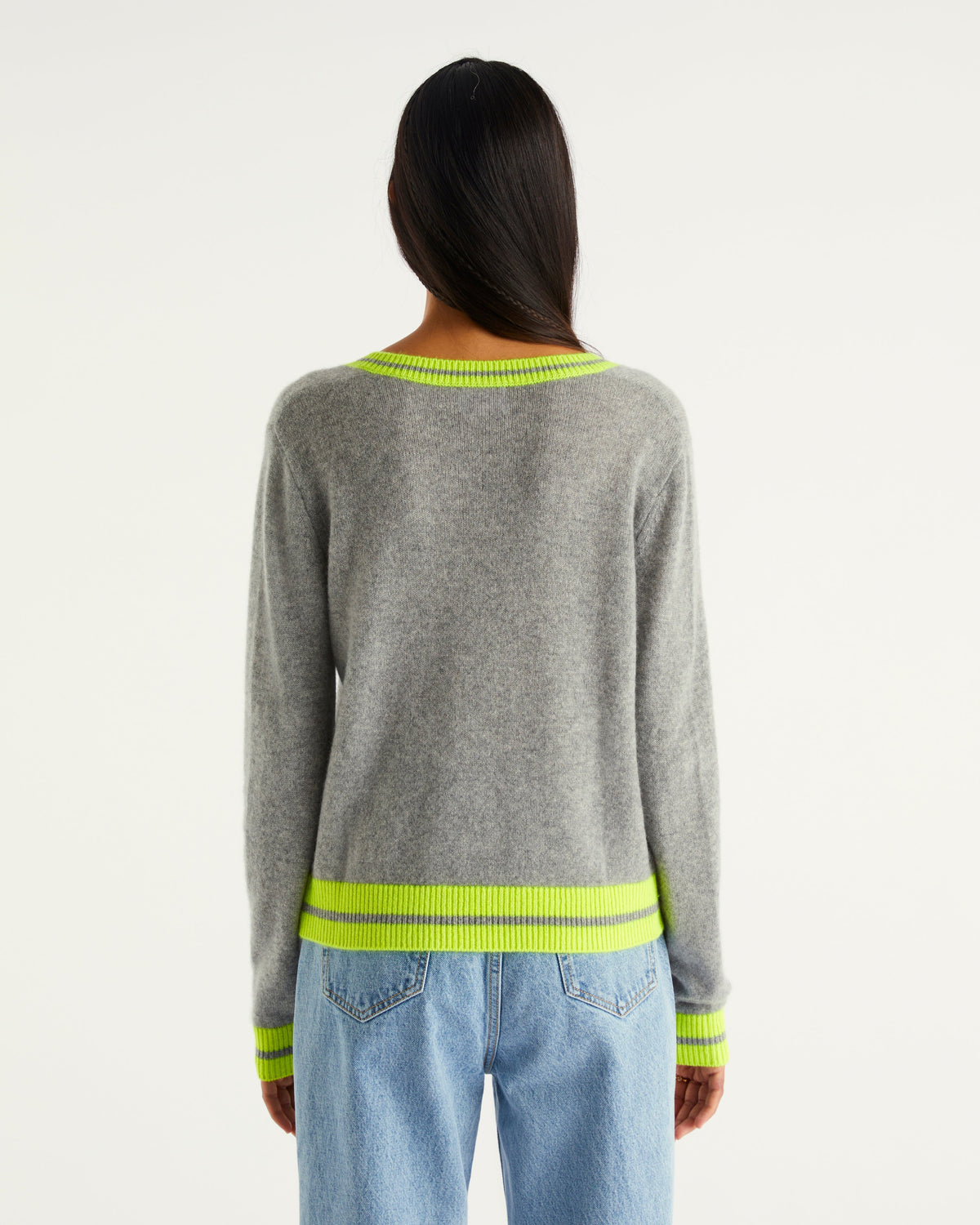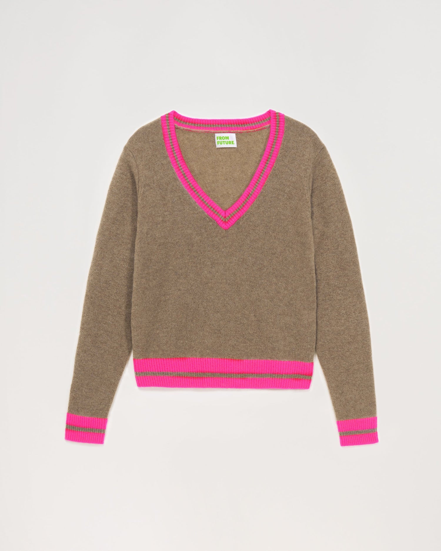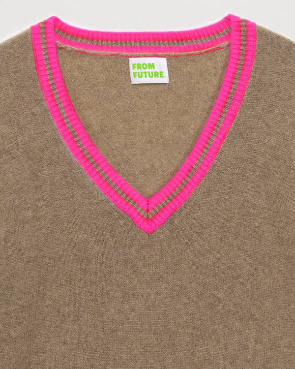Sweater Col V Court Rayure Tennis 2 Fils - 100% Cachemire - Taupe