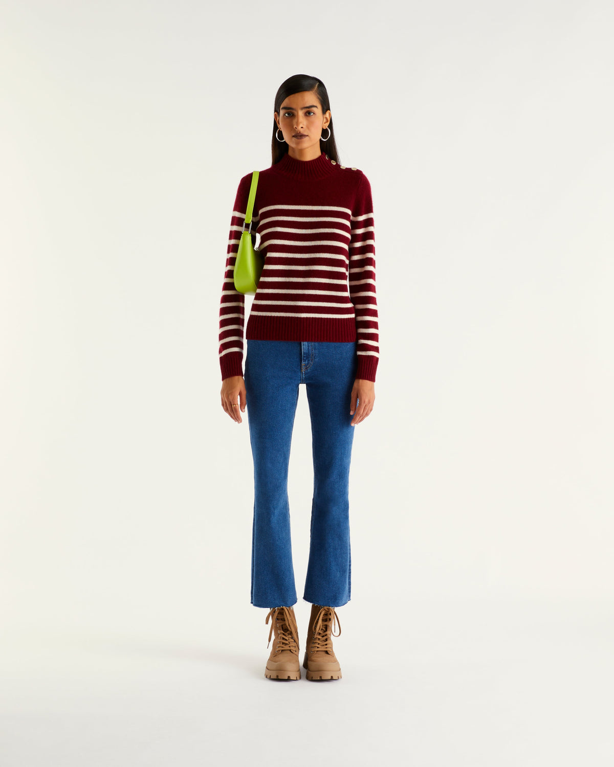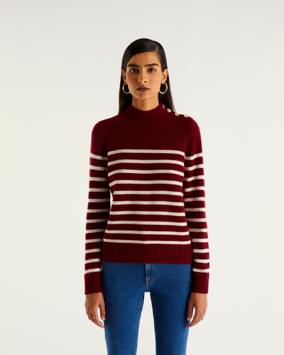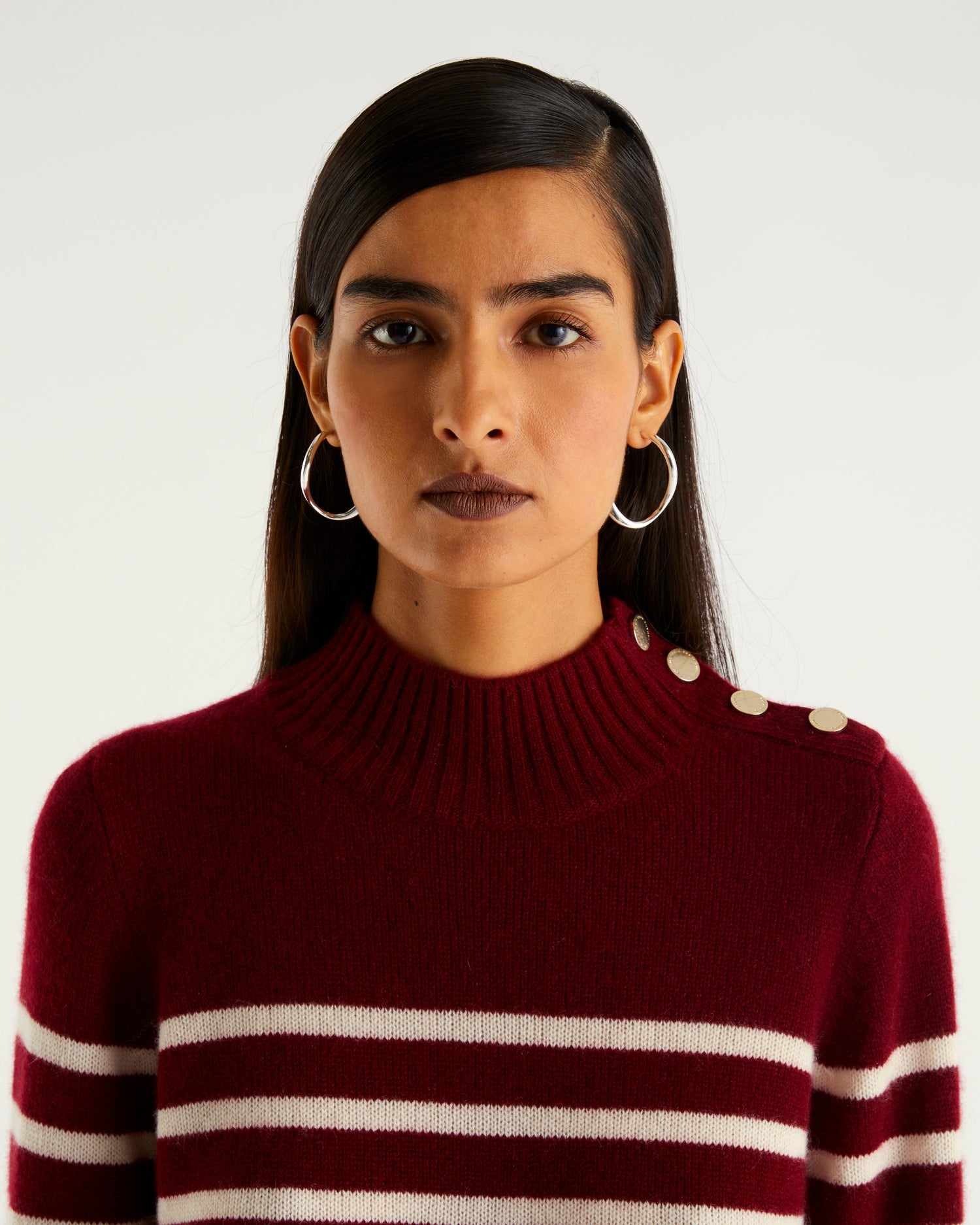 Sweater Marinière Col Montant À Bouton 4 Fils - 100% Cachemire - Prune