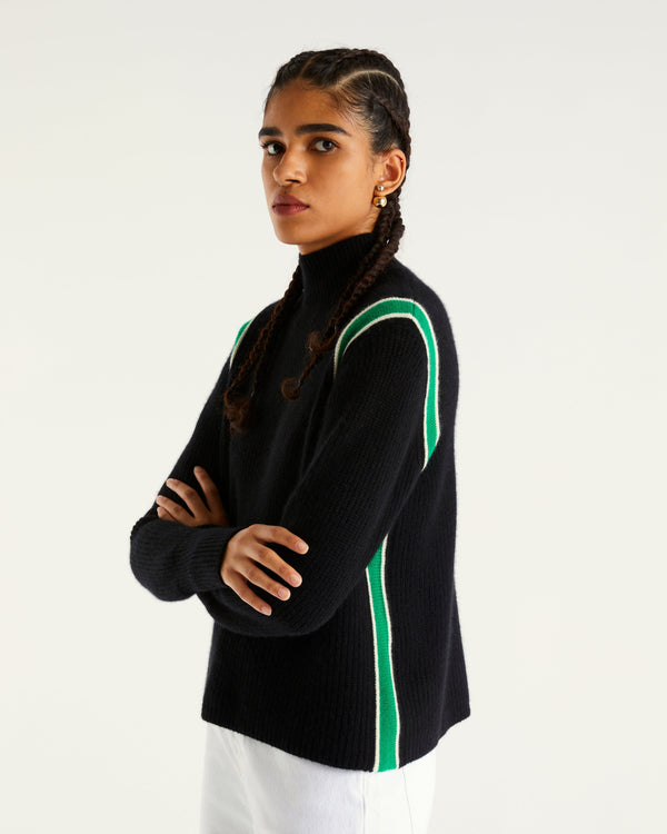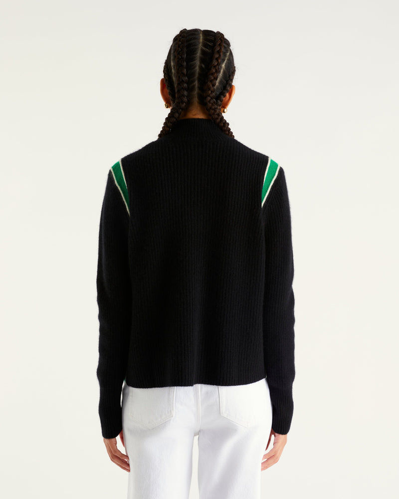 Sweater Col Montant Court Maille Perlée Bande 4 Fils - 100% Cachemire - Noir