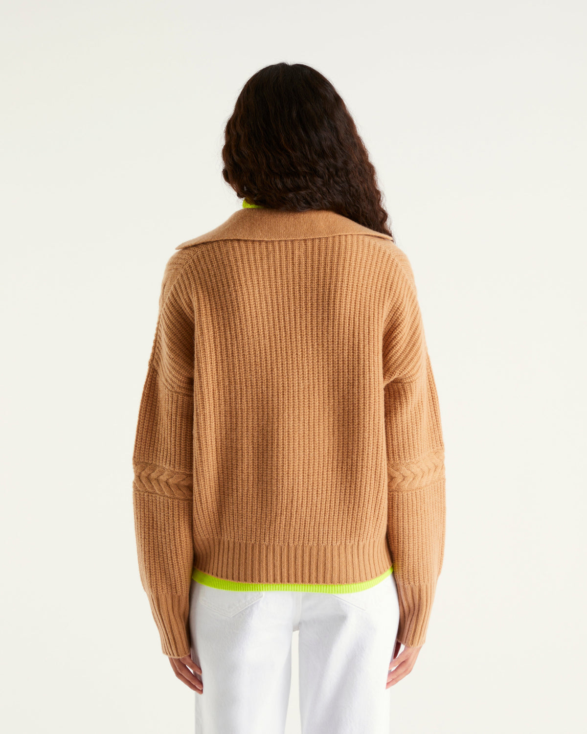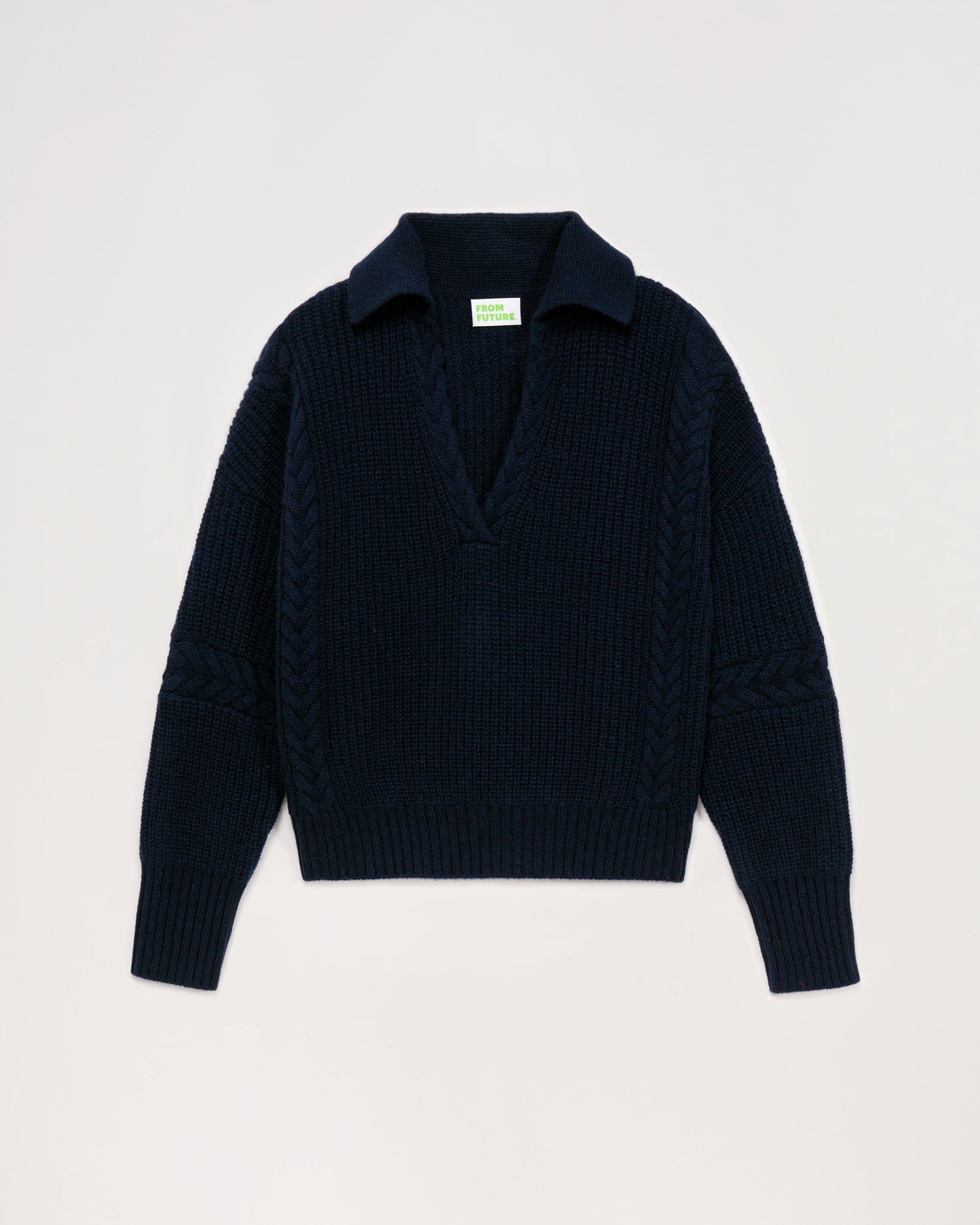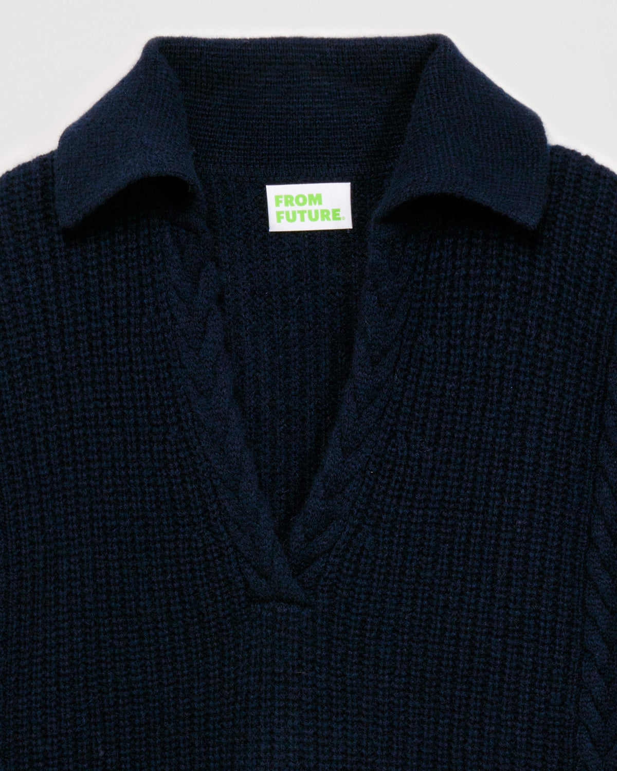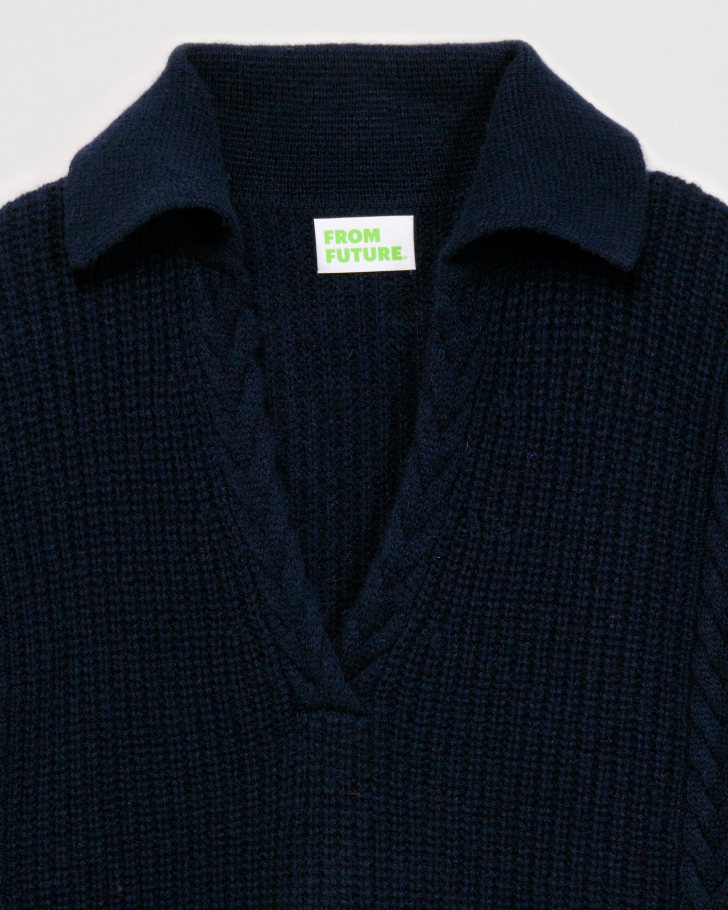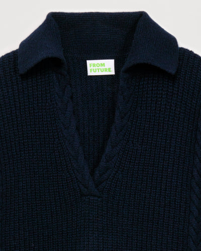 Sweater Col Polo Court À Torsades 6 Fils - 100% Cachemire - Navy