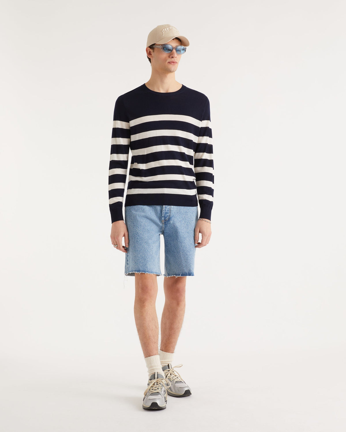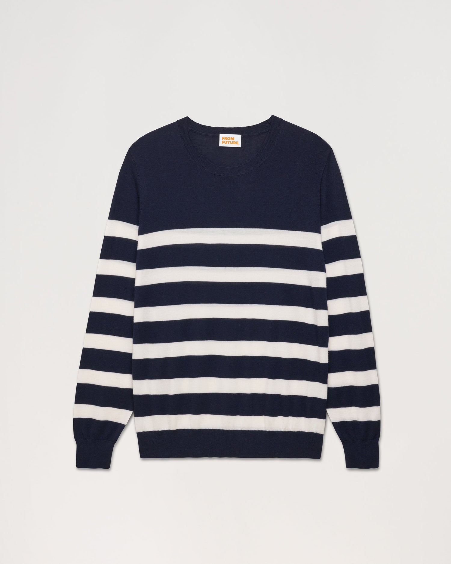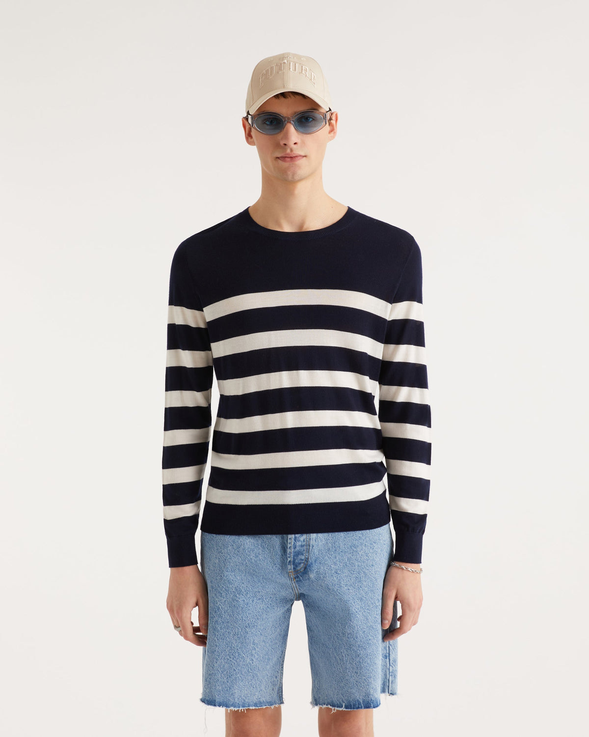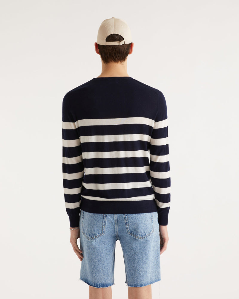 Sweater Pull Col Rond à Rayures - Laine Mérinos - Navy