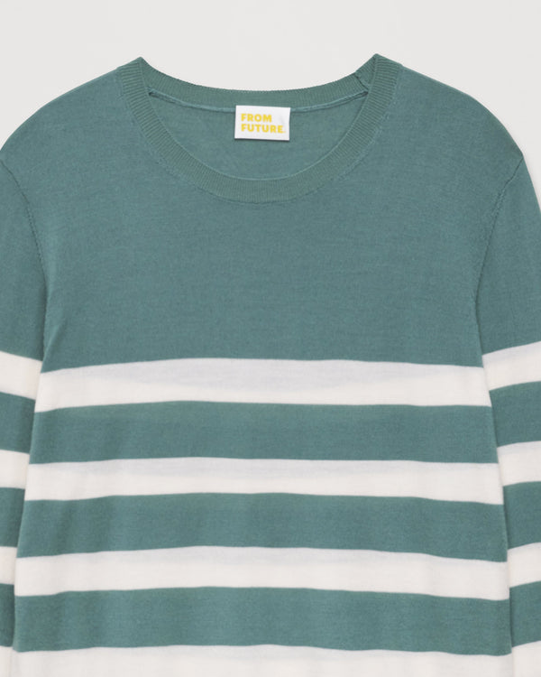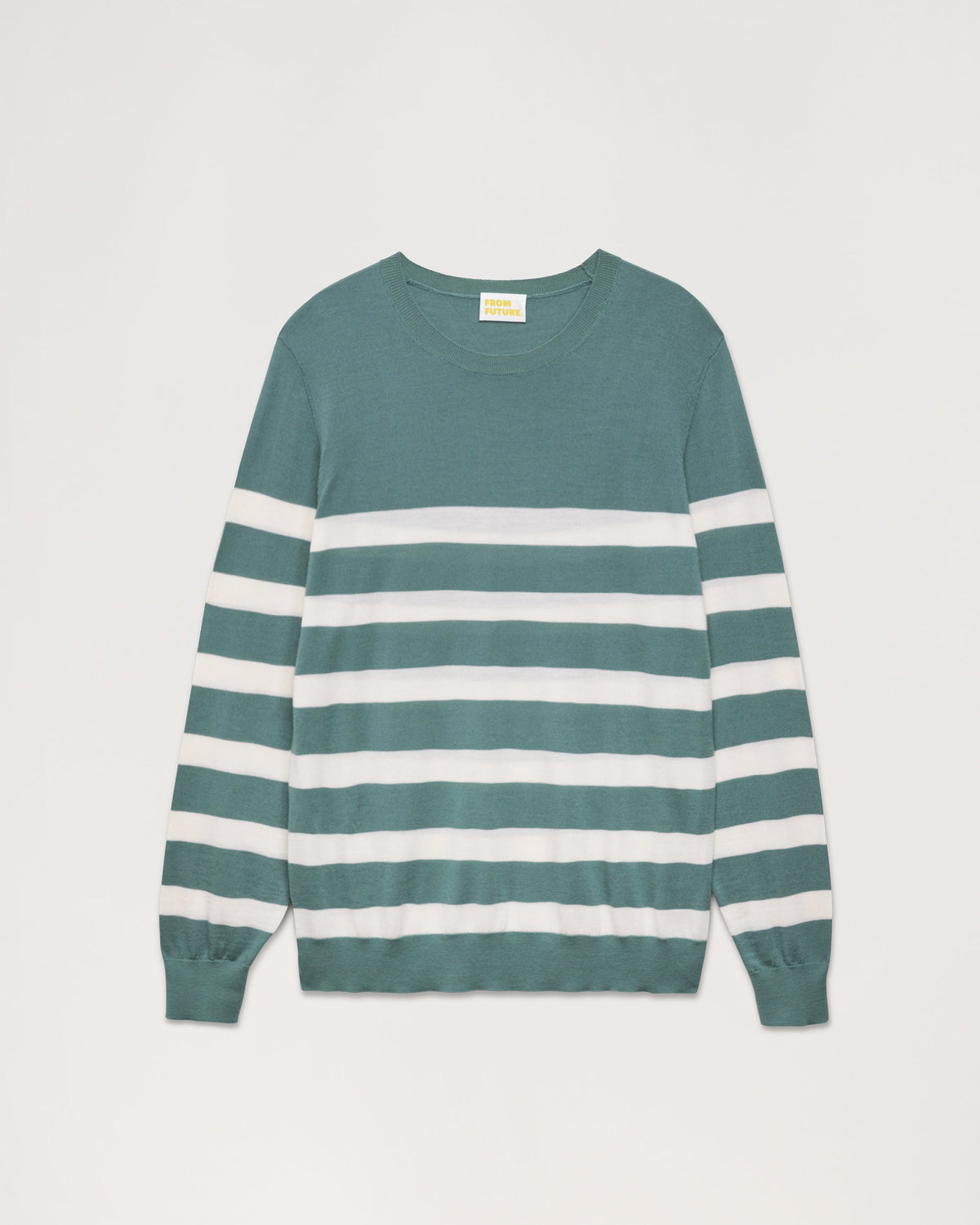 Sweater Pull Col Rond à Rayures - Laine Mérinos - Washed green