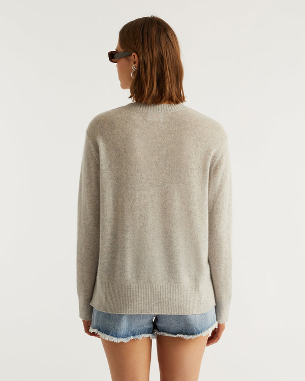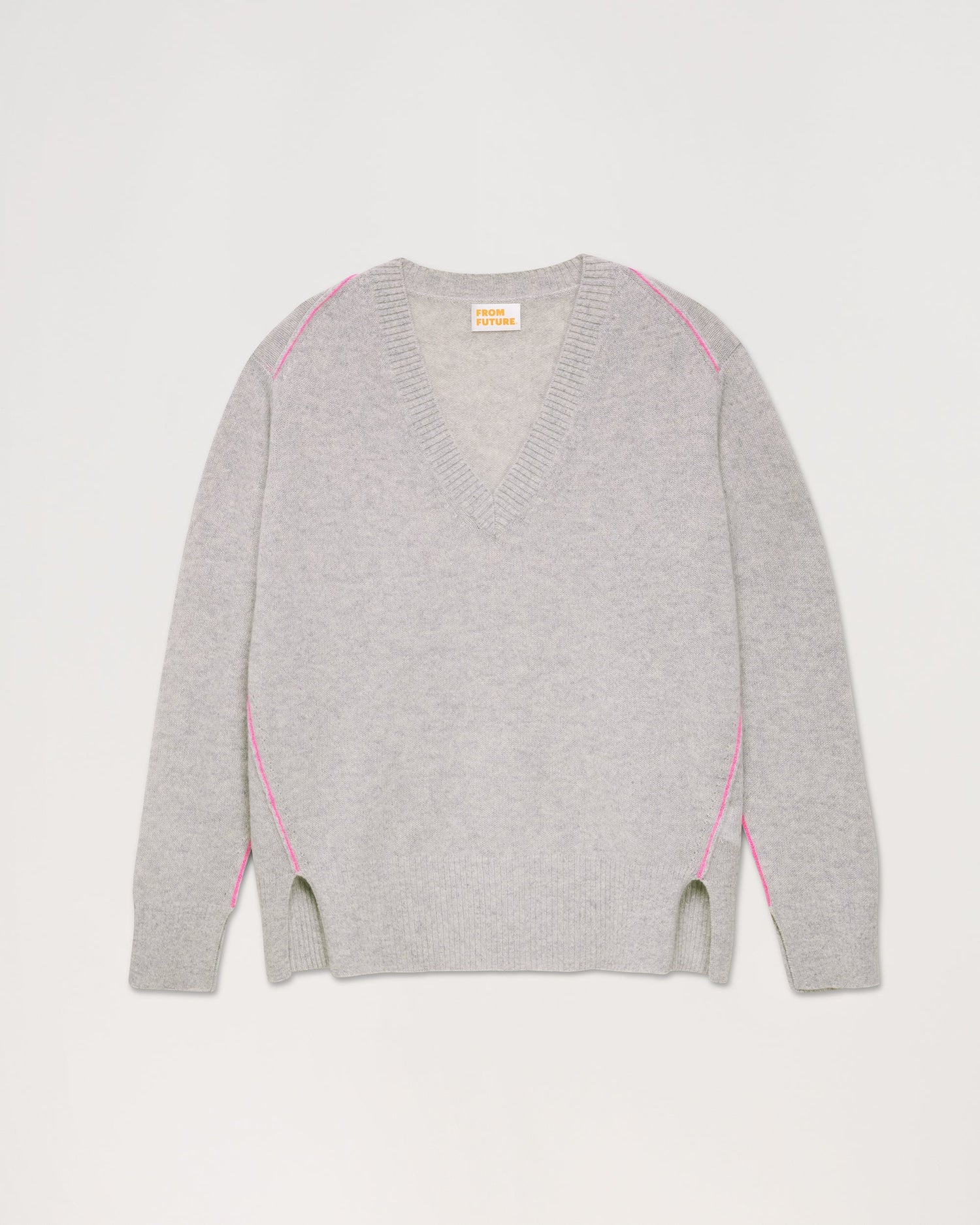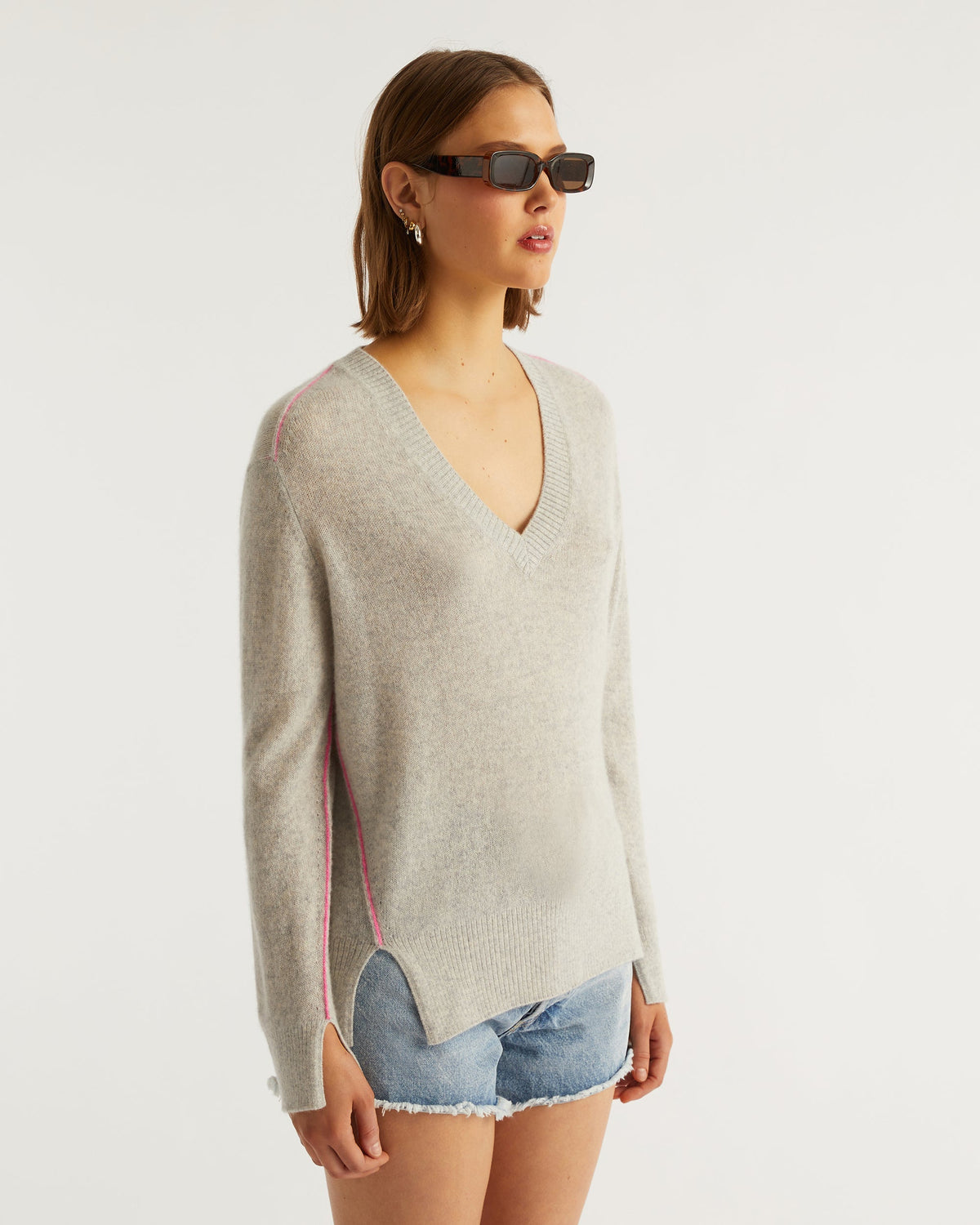 Sweater Pull Col V Coutures Contrastees Light - Cachemire - Gris chine clai